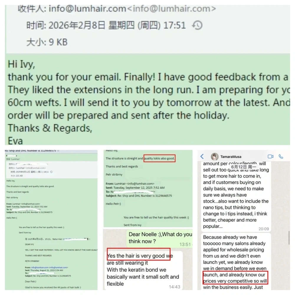 Los clientes de Lum Hair se encuentran repartidos por el Reino Unido, EE. UU., Canadá, Australia, Dinamarca, Nueva Zelanda, Noruega, Alemania, Francia, Países Bajos, Suecia, Polonia, República Checa, Eslovaquia, etc. Ivy, como gerente de ventas, puede hablar inglés con fluidez para una buena comunicación.