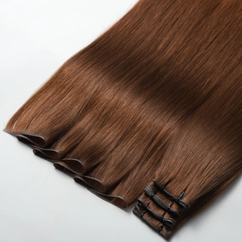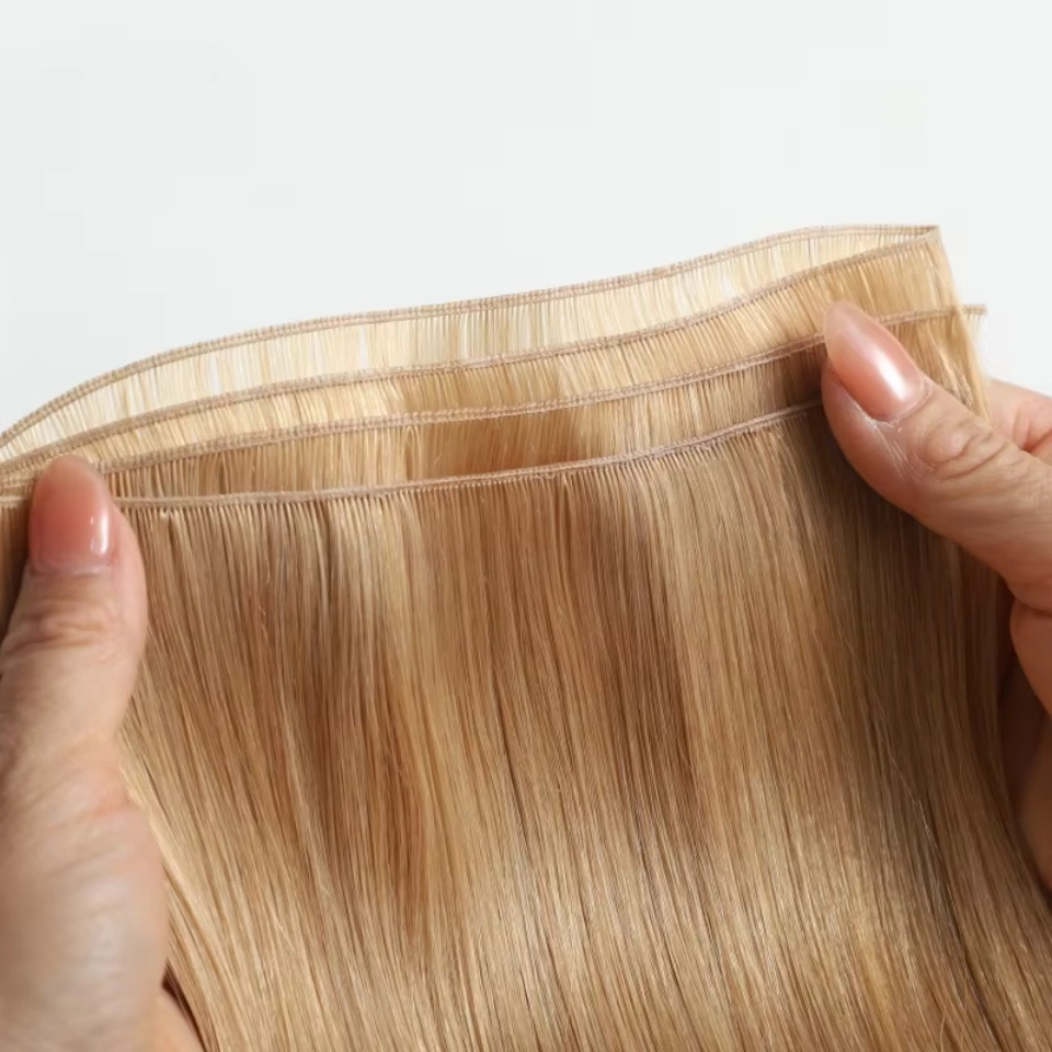 Las tramas tradicionales son las extensiones de cabello originales hechas a máquina, conocidas por su durabilidad y versatilidad, con una banda de cabello más gruesa. Se pueden cortar a medida y utilizar para añadir volumen y longitud. También se pueden unir con cuentas o coser.