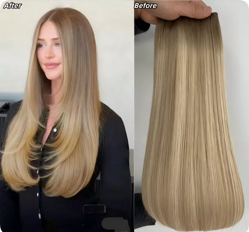 En la etapa "antes", los mechones de cabello presentaban texturas suaves y rectas en tonos castaños rubios arraigados. La calidad y el brillo ya eran visibles, aptos para uso profesional. Sin embargo, “después” de la instalación y el diseño del salón, la apariencia evolucionó hacia algo mucho más llamativo. El volumen aumentó, el movimiento mejoró y la combinación de colores pareció más natural.